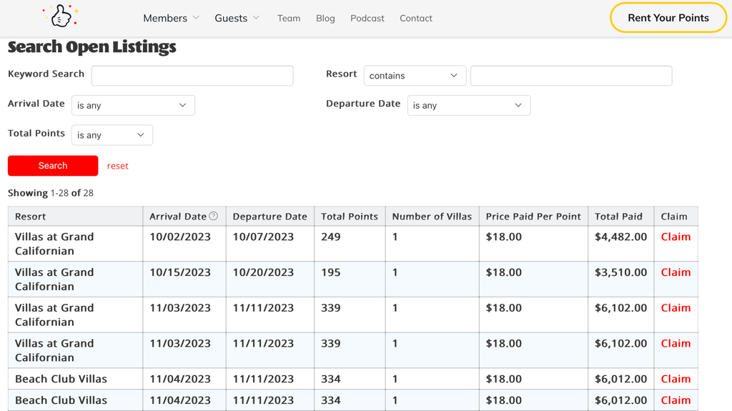 If you book a resort reservation but later find that you cannot travel, this option may be for you. Rather than trying to match your points to a request, you can put the reservation up for rent as is. Guests can then browse the confirmed reservation listings to find a reservation that works for them. If a guest would like to book your confirmed reservation, you just have to update the reservation with the names of the new guest(s).