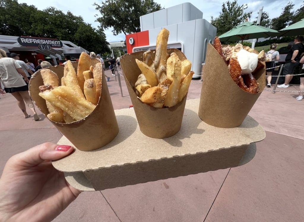 The Fry Basket remains one of the most popular booths, and the Fry Flight ($8) proves why. The Truffle-Parmesan Fries are creamy and rich, with the cheese flavor front and center. The Sweet Potato Casserole Fries lean sweet with a large dollop of marshmallow cream and candied pecans, turning the dish into an almost-dessert. And the Sea Salt and Malt Vinegar Fries provide a tangy, classic fry flavor that feels just right for EPCOT snacking. Together, the three styles create a well-rounded, crave-worthy dish that can even be modified for a fully plant-based version.