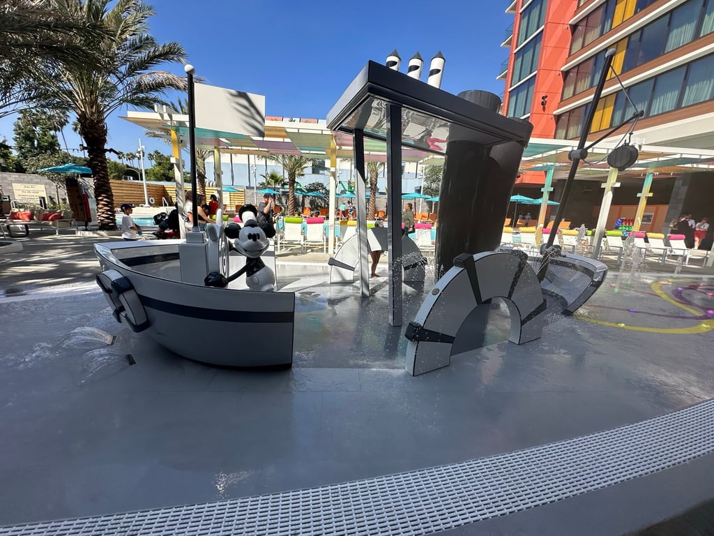 Families with little ones will love the resort’s splash pad, featuring the mouse who started it all! The splash pad at the Palette Pool has Mickey at the helm of his steamboat. You’ll notice the steamboat sprays mist from its pipes. Be sure to visit the splash pad at different times of the day. As the sun goes down, the splash pad magically changes from black and white to color!