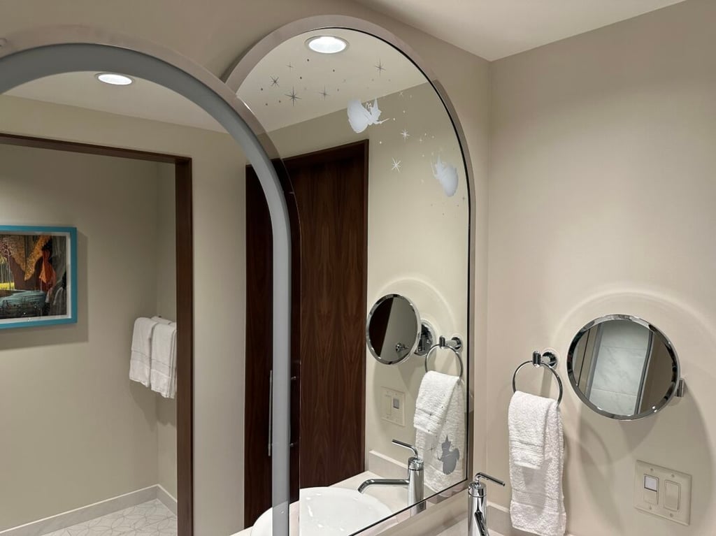 Aside from the color palettes, there are lots of subtle details woven into the decor. For example, the rooms themed to “Sleeping Beauty” have the three fairies along the bathroom mirror. You will also notice that the themed bed headboards in the Deluxe Studios and larger villas light up. The tiles behind the TV not only add texture and dimension but have symbols reflective of the movie. The rooms really balance the modern style and function of a deluxe resort with a touch of Disney magic!