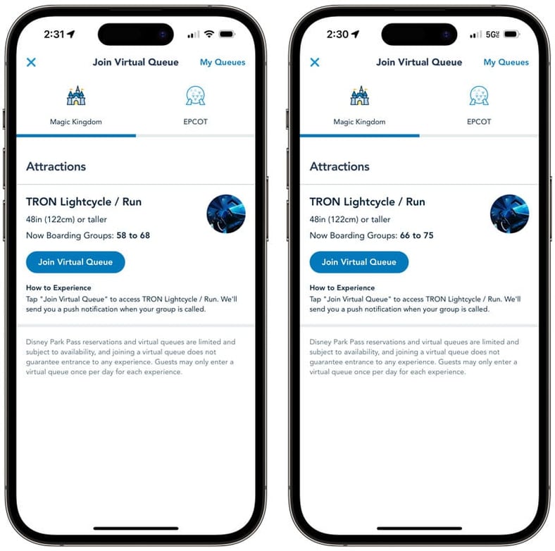 The latest and greatest attractions at Walt Disney World don’t offer standby lines. Instead, Disney offers a free virtual queue through the My Disney Experience app, so guests don’t have to physically stand in incredibly long lines. Currently, TRON Lightcycle / Run at the Magic Kingdom and Guardians of the Galaxy: Cosmic Rewind at EPCOT use virtual queues. Here are some pointers on how to join a virtual queue for these attractions.