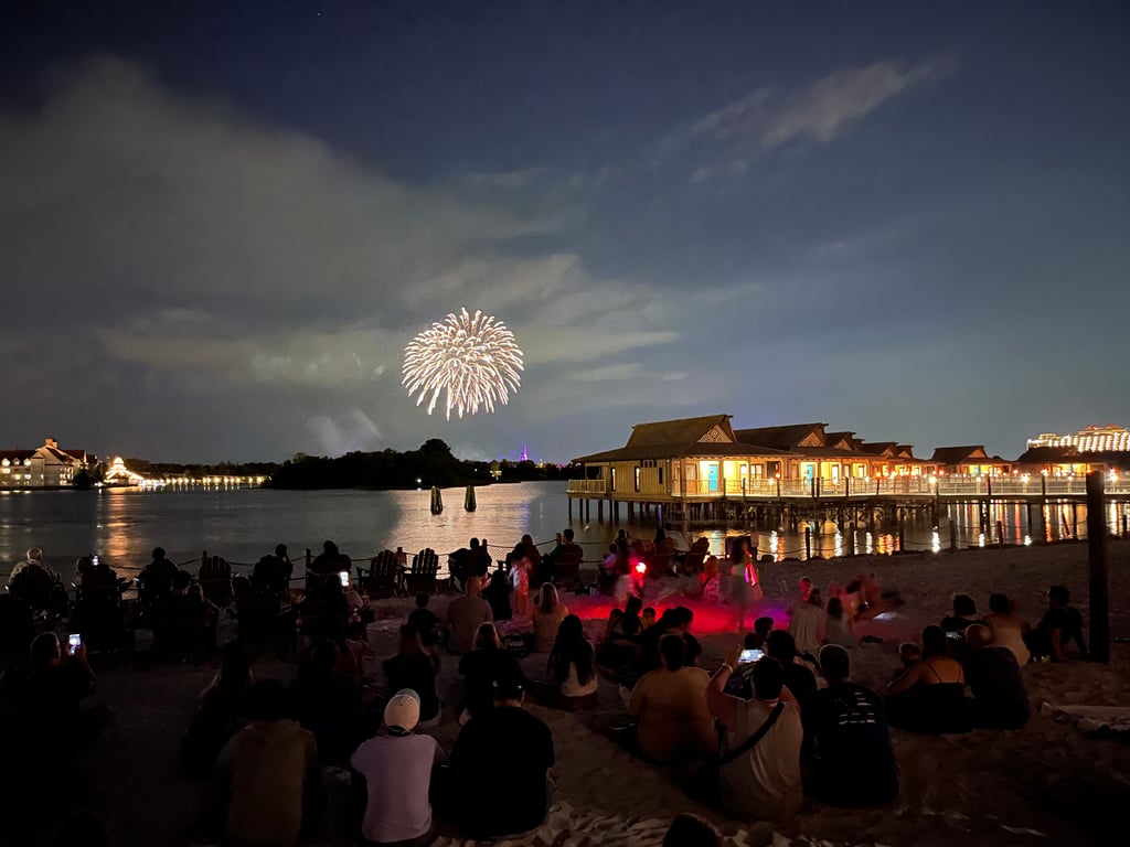 Even on a resort-only day, you can still enjoy fireworks from the Magic Kingdom! Head to the beach at the Polynesian for a great view with Cinderella Castle across the Seven Seas Lagoon. During the show, you can hear the soundtrack since the music played from speakers at the beach. Watching from the Polynesian is a great way to view the nighttime spectacular without needing a park ticket or braving the crowds.
