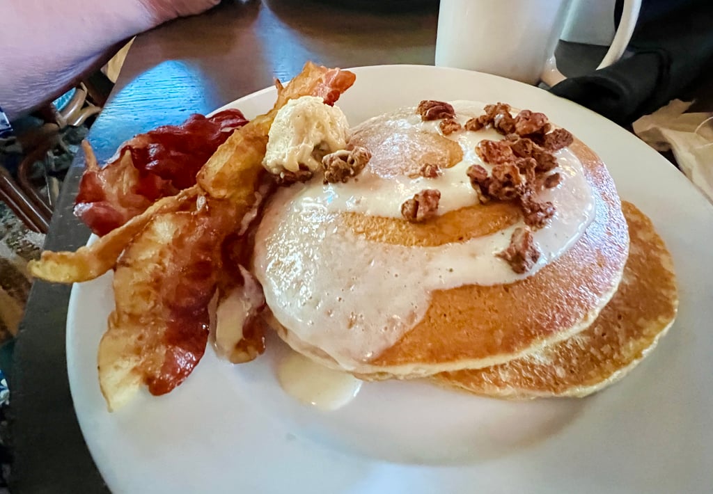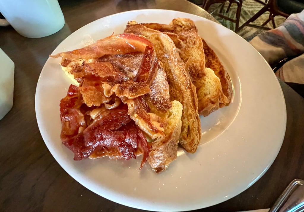 My father-in-law opted for the caramel-banana sauce-covered French Toast ($15) and savored every single bite. As with most of the other entrees on the menu, guests have their choice of breakfast meats, and my father-in-law chose bacon.