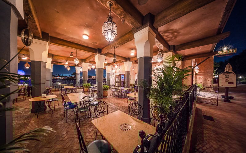 This quick service restaurant in the Mexico Pavilion is a good spot to have dinner along World Showcase Lagoon and catch the fireworks. There are tables along the lagoon that have a nice view of the show–no dining reservation needed! If you prefer a table service restaurant, La Hacienda de San Angel in the Mexico Pavilion also has good fireworks views from the tables by the windows.