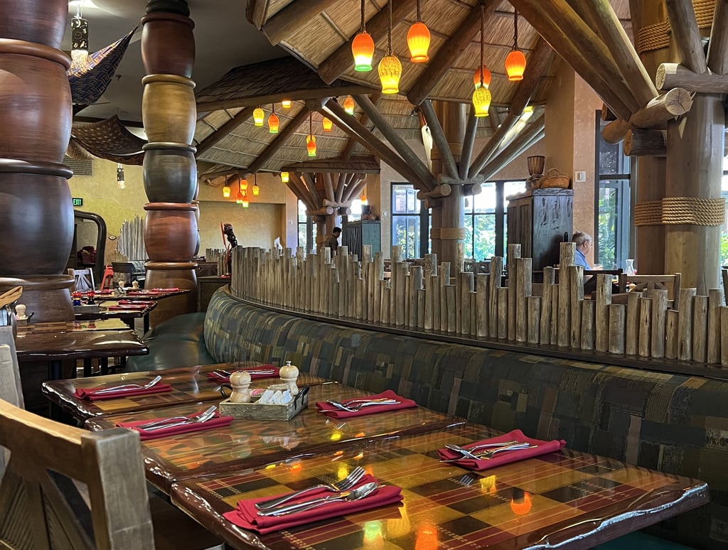 Could this resort be any more gorgeous? Walking into Disney’s Animal Kingdom Lodge is like stepping into another world. The warm lighting, rich wood tones, and cultural details instantly make you feel immersed in the story of Africa. Once checked in, you wait in the cozy seating area near the host stand before being called to your table. Even before breakfast begins, the atmosphere feels special.