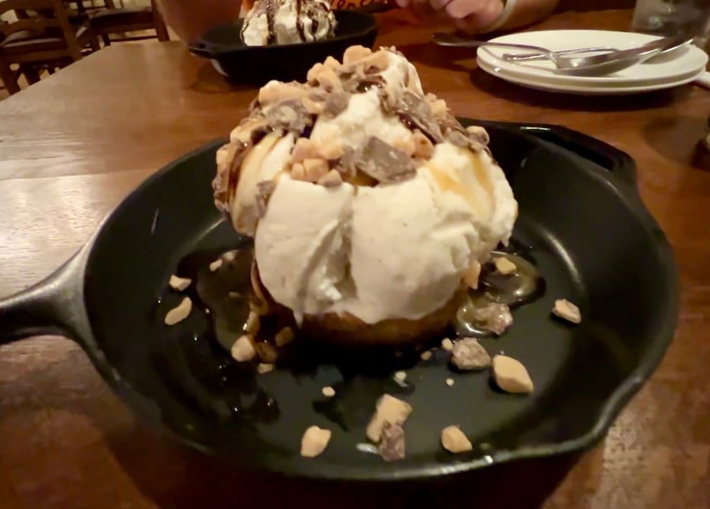 Dessert is where Liberty Tree Tavern shines brightest. The Ooey Gooey Toffee Cake is rich, warm, sweet, and exactly as indulgent as it sounds. Picture a chewy vanilla-toffee cake topped with chocolate sauce, toffee bits, and vanilla ice cream, all served in its own little skillet. Honestly, it could be one of the best desserts on Walt Disney World property.