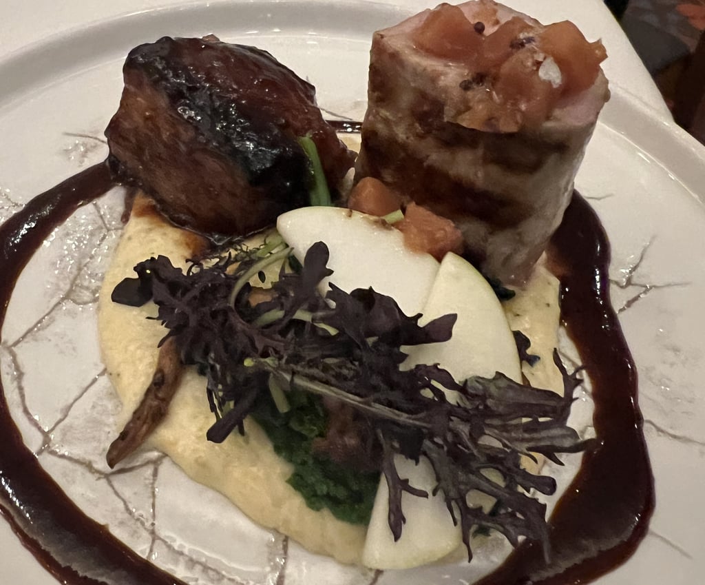 My husband chose the Grilled Pork Tenderloin, which features creamy goat cheese polenta, roasted pork belly, aged balsamic, and organic mushrooms. The pork belly was especially well executed and added a rich, decadent note to the dish.