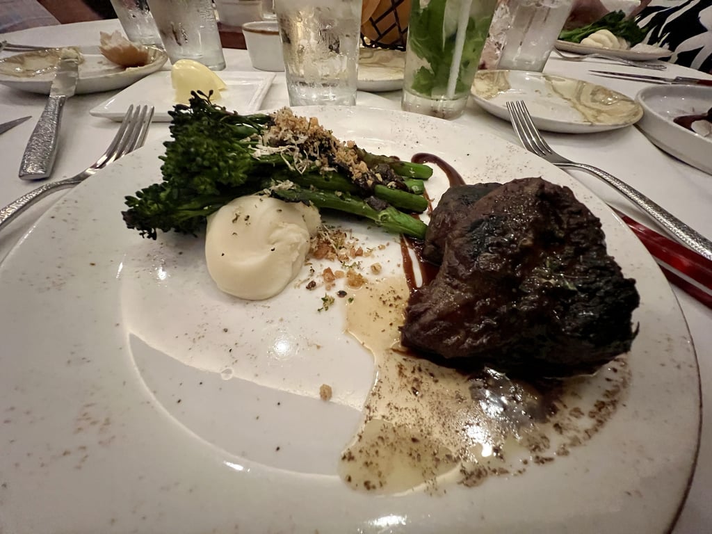 For my entrée, I chose the Oak-Grilled Filet of Beef, served with roasted garlic potato puree, charred broccolini, fig-onion marmalade, and reduction jus. I ordered mine well done, which I know pains many a chef, but even fully cooked, the filet was tender, flavorful, and beautifully charred.