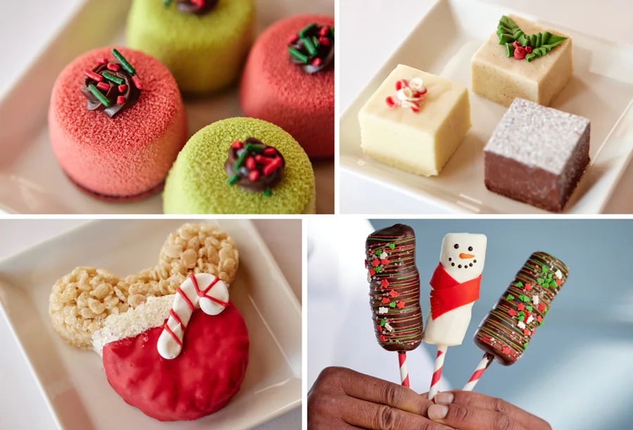 - Mickey and Minnie Crispy Rice Treats (Sold Separately) – Crispy rice treats decorated with red chocolate, sanding sugar, snowflakes, and chocolate garnishes (available Nov. 1- Dec. 31)
