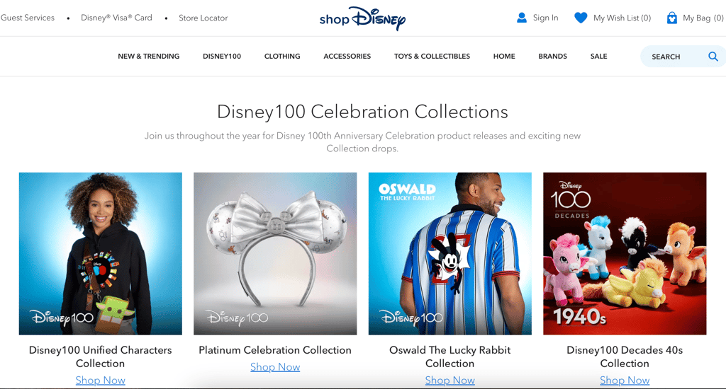 From apparel to popcorn buckets and more, you’ll find a wide variety of merchandise commemorating the 100th anniversary. Much of the merchandise can be found online at shopDisney. There are a few different collections to choose from, including the Platinum Celebration Collection, Disney100 Unified Characters Collection, Oswald the Lucky Rabbit Collection, and Disney100 Decades Collections.