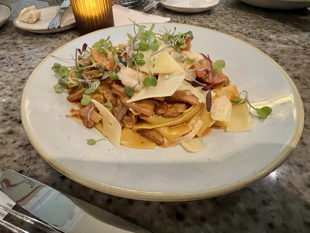 The menu strikes a wonderful balance between approachable favorites and more elevated options. There are seven appetizers and seven entrées, each with its own personality. Starters include a shrimp cocktail, a seasonal soup, Heirloom Apple Salad, and Carnitas Tacos.