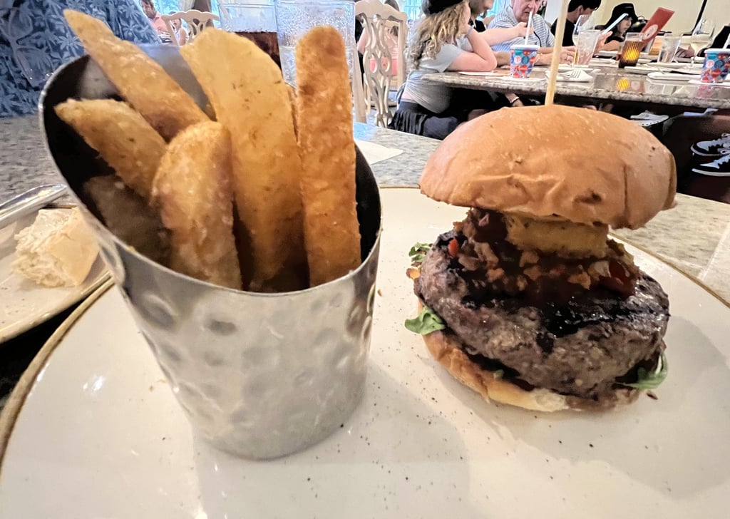 For entrées, the Buttermilk Fried Chicken remains a standout, served with loaded smashed potatoes and a warm bacon vinaigrette that is as delicious as it sounds. The Grand Floridian Café Burger comes stacked with a chunk of brie cheese, bacon pepper jam, roasted garlic aioli, and arugula on a brioche bun. It is simple, hearty, and beautifully done.