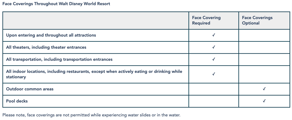 Effective Saturday, May 15th, 2021, guests visiting Walt Disney World will no longer be required to wear a face-covering in outdoor common areas throughout the resort. Don’t throw away that face mask just yet though, as they will still be required when entering queues and throughout all indoor attractions, theaters, transportation, and more. Disney has provided this graphic to easily explain when and where a mask is required:
