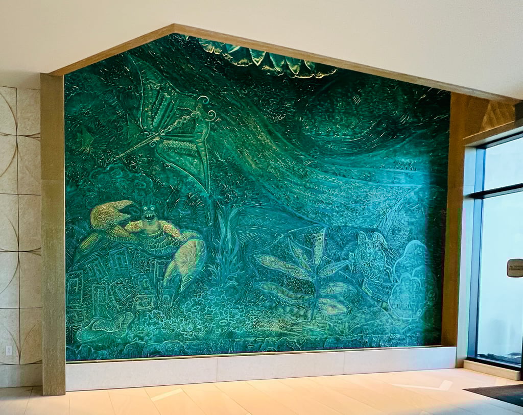 Inside the lobby, you’ll find that sand-colored tones wash across the floor while watery blues can be found in the artwork located throughout the space. Just overhead, guests will find depictions of sea creatures floating, as well as light fixtures that create the image of stars dancing on water or dappled sunlight coming through the waves. I cannot tell you how very beautiful this space is.