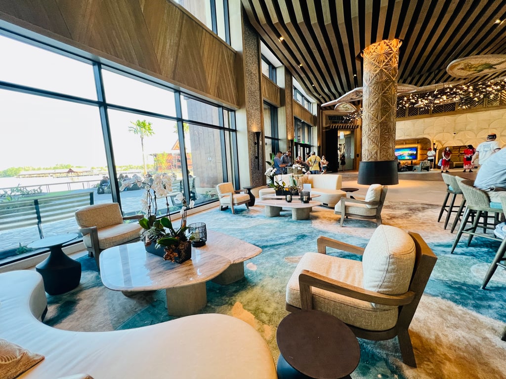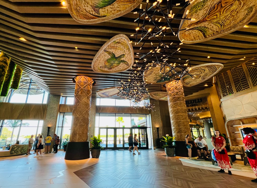 The lobby and its surrounding areas are lush with a wash of colors representing the Earth, the sky, and the sea. You’re sure to see guests lounging in the Adirondack chairs on Te Fiti’s Terrace as you approach the building. It immediately speaks of the laid-back and relaxing nature of the space, in stark juxtaposition with the busyness of the Magic Kingdom that sits just across the water. Guests are welcome to stay, sit and take a load off, and it’s incredibly inviting. You’ll also find an expansive wood-clad seating area just to the right of the lobby entrance. This space is the perfect vantage point for viewing evening fireworks, too!