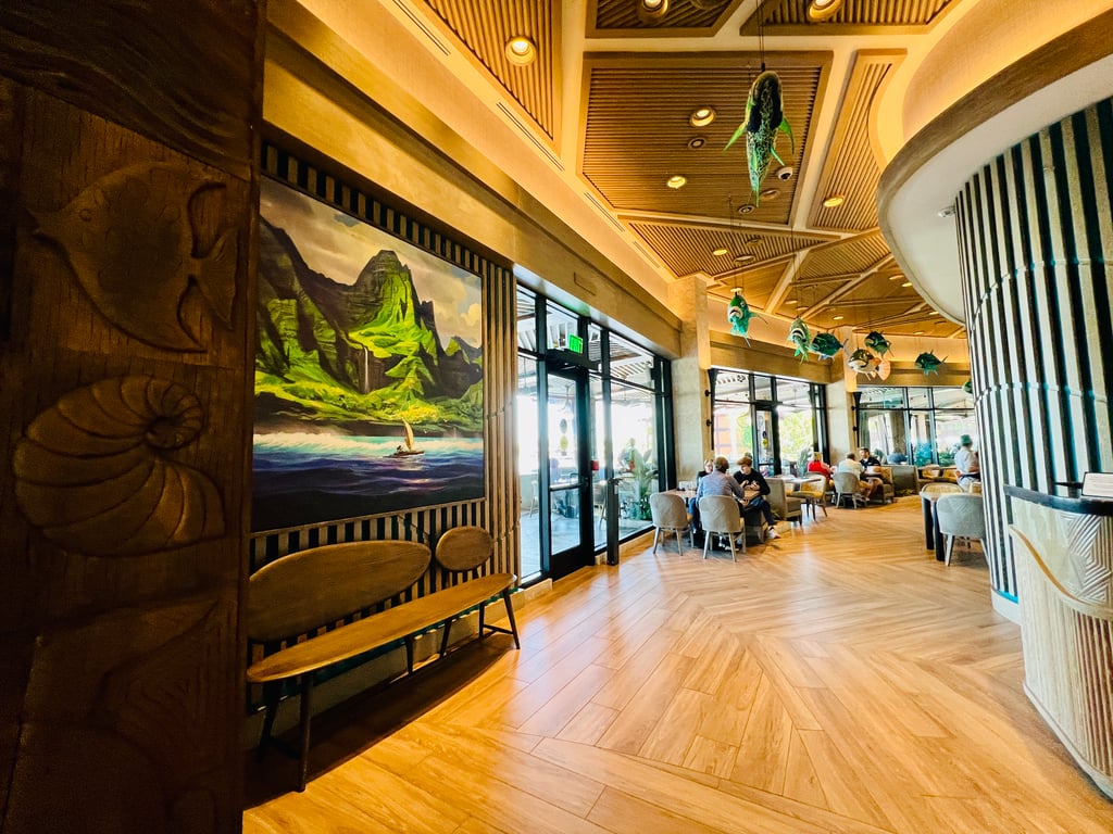 Even if you’re not having a meal in the tower’s restaurant, Wailulu Bar and Grill, I highly recommend that you step into the space to observe all of the incredible decorating touches used throughout. Don’t miss the Moana artwork just to the left of the main door. And speaking of the restaurant’s door, please stand and gaze as I did at its sheer height and heft. This is art on display, and it’s so much fun to see this level of intentionality poured into a space that is typically something that guests spend little time in. A lobby is meant to be a portal to another destination, but this lobby is a destination all on its own.