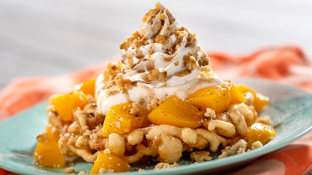 - Peaches ‘n’ Cream: Funnel cake with powdered sugar, vanilla ice cream, peaches, whipped cream, cobbler crumble, and cinnamon-bourbon caramel sauce