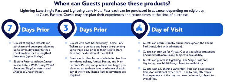 Guests have the option to buy Lightning Lane Single Pass and Lightning Lane Multi Pass 7 days prior, 3 Days prior, or on the day of visit at 7 a.m. Eastern. This allows you to plan your experiences and return times ahead of time.