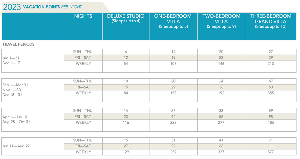 Hilton Head Island has a very reasonable points chart compared to the other DVC resorts. Deluxe Studios start at 6 points per night throughout January and parts of December, and the Three Bedroom Grand Villa tops off at 111 points per night during the peak of the summer crowds.
