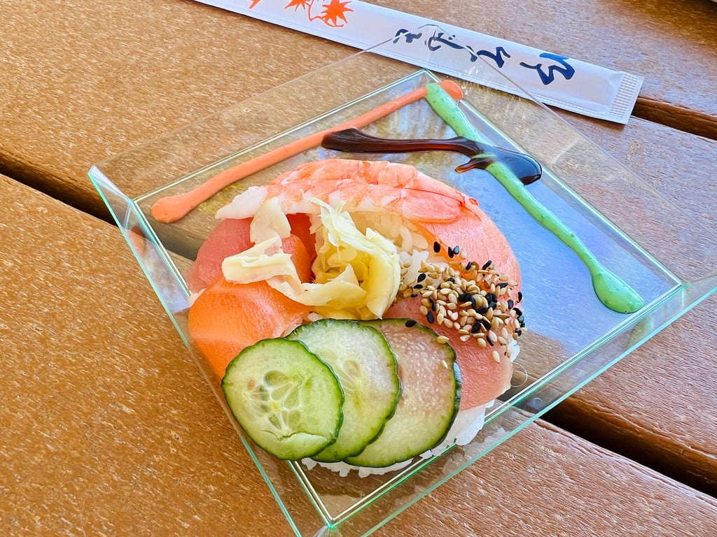 The Sushi Donut at the Goshiki Food Studio is another festival creation that I highly recommend you try. It’s possible that you aren’t a sushi fan as it seems to be a little polarizing, but if you’re even slightly sushi curious, please try the Sushi Donut. As I’m sure you can tell from the picture above, it’s more sushi than donut, but it’s the perfect beginner-level sushi as it acts as a sampler of sorts. It’s fresh and delicious, and you might just find yourself actually enjoying sushi for the very first time. Don’t forget to utilize the sauces that are artistically displayed on the side of the donut; they’ll heighten your sushi experience!