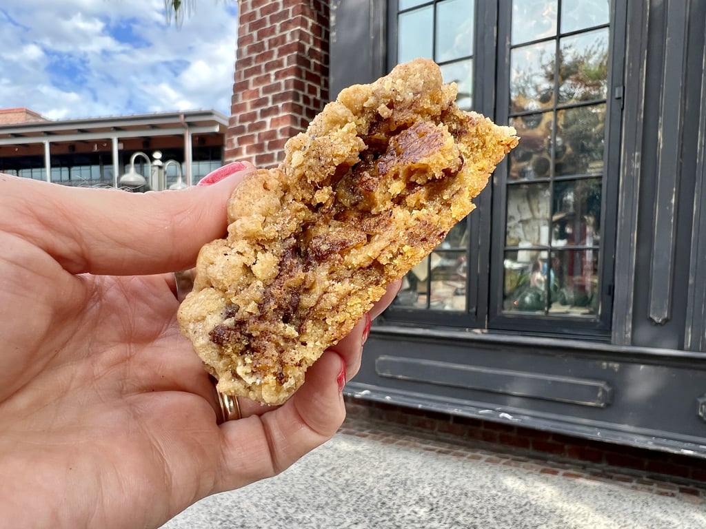 That wonderfully thick, sugary crumble on top is the perfect companion to the pumpkin filling inside. And yes, you read that right, it’s a filled cookie. Break it open and you’ll find real pumpkin, spices, and sugar, all gloriously glistening in the Florida sunshine. It’s a sight to behold.