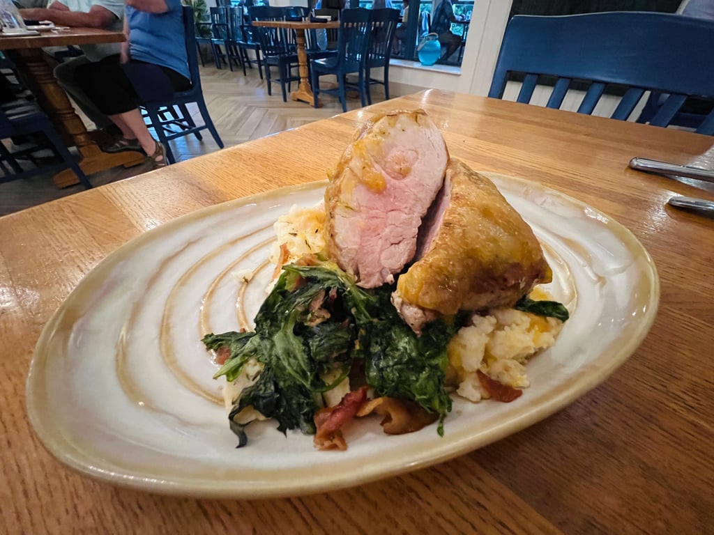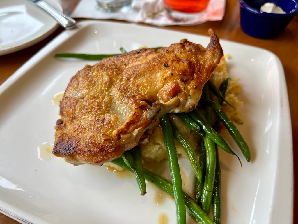 The second night of the stay had me struggling to choose between the Roasted Chicken and the Shrimp and Grits. I’ve had the Shrimp and Grits before, and it’s delicious dish. The Roasted Chicken, however, sounded comforting and somewhat adjacent to a Thanksgiving style meal, which sounded good to me at the time. Friends, I chose correctly. The chicken breast was prepared airline style, and with skin on. The breast had been roasted to the most deeply, gorgeous golden brown, and was incredibly moist and flavorful. It sat atop of bed of cornbread dressing, which was both sweet and salty. I seriously could’ve eaten twice the amount of dressing; it was that good. The entrée also featured whipped potatoes, green beans (which were prepared to perfection), and gravy.