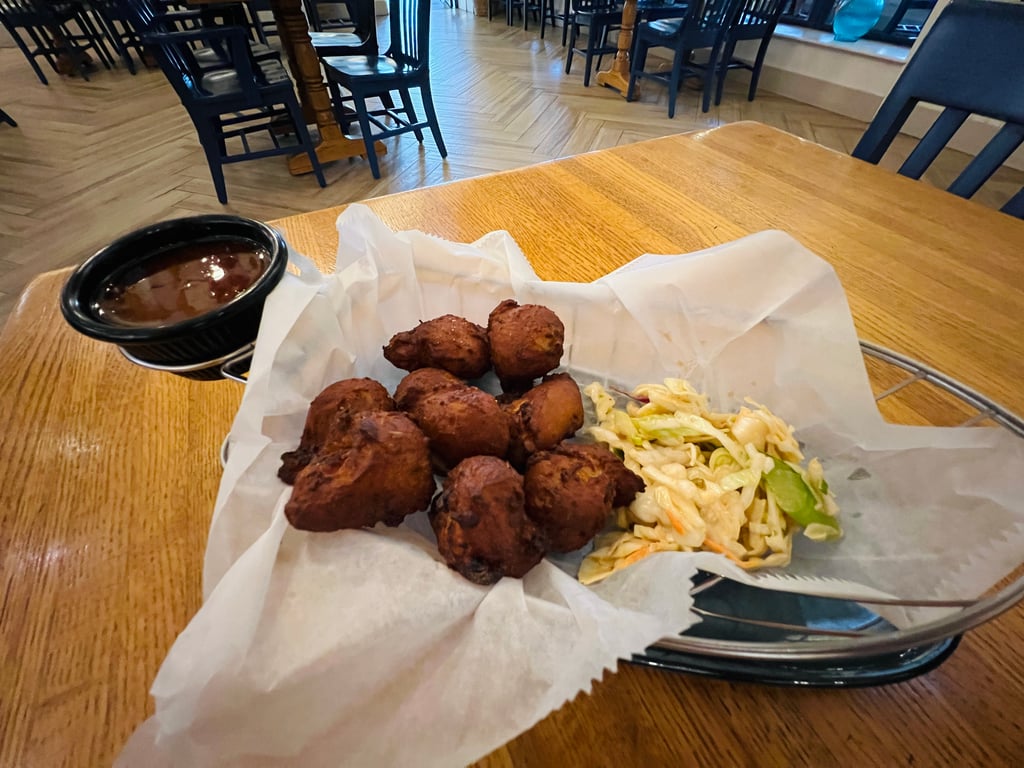 During the meal on our first evening at the resort, we tried the Shrimp and Sweet Corn Hushpuppies appetizer ($15). This wasn’t our first time having these little babies, but was the first time in a long time, and it was a delight to be reminded of how very good they are. Moist and filled with corn and shrimp, you’ll want to be sure to savor them with just a bit of that sweet chili dipping sauce that comes alongside them.