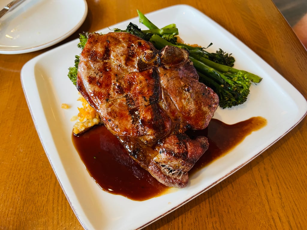 My husband’s second meal had him leaning toward the specials menu. He had debated getting the Kurobuta Pork T-bone Chop ($34) the night before, and he wasn’t going to go without it again. The pork T-bone chop was absolutely massive, and my husband ate every single bite. It came with broccolini and a cheesy potato casserole that was out of this world.