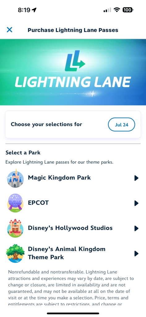 - Choose Your Park: Select the park where you will choose your three included attractions. If you have a Park Hopper, you will have the option to select Lightning Lanes from other parks after those original attractions.