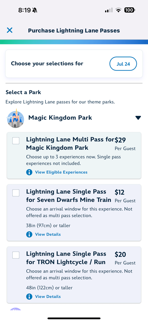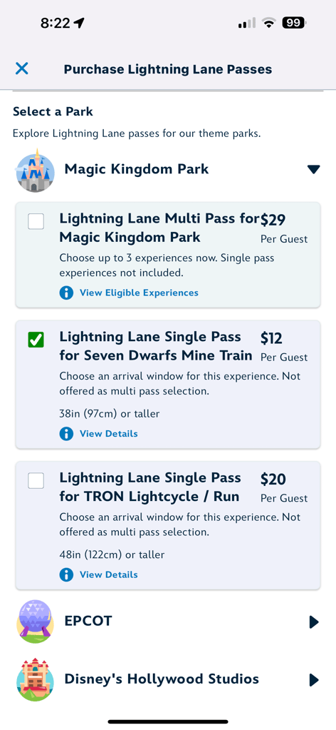 - Choose Your Park: Select the park and then view available Single Pass attractions (e.g., Seven Dwarfs Mine Train and TRON: Lightcycle / Run).