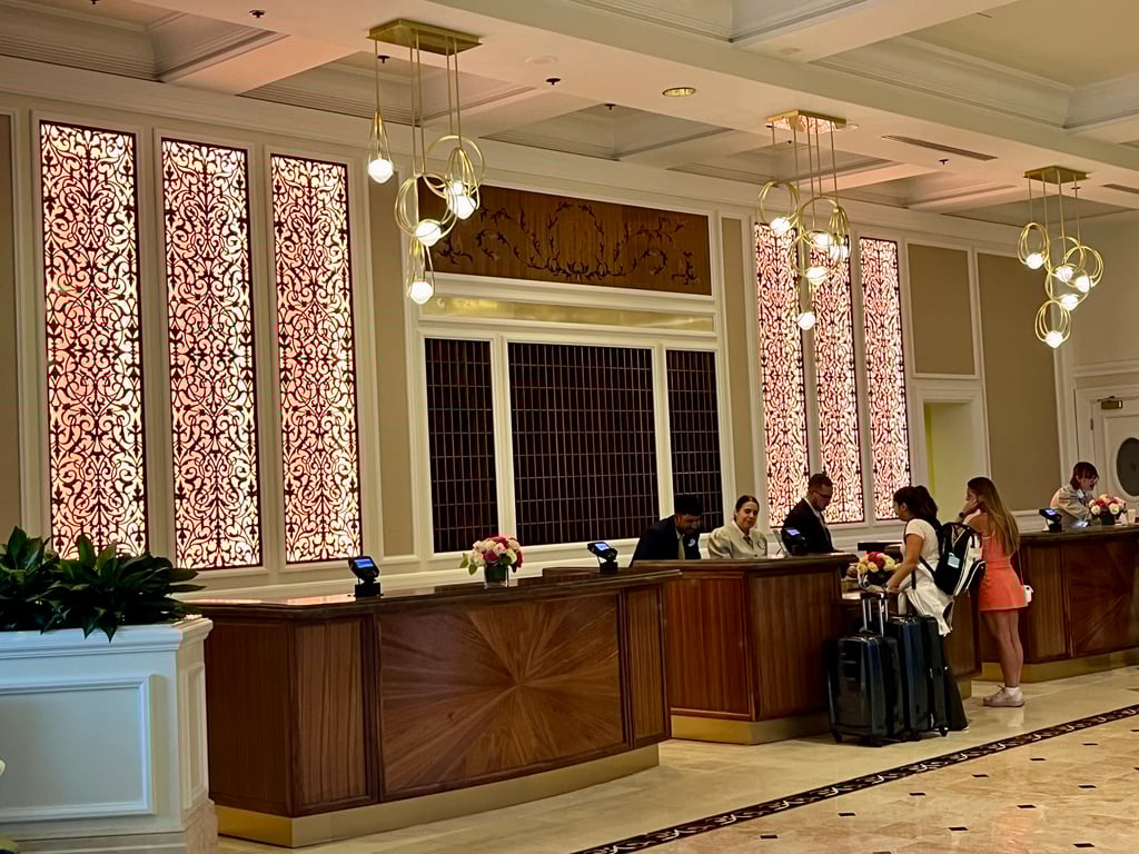 Guests staying in the Resort Studios in the Big Pine Key building typically prefer to check in at the main building since it’s closer to Big Pine Key than the original DVC building. As of October 2025, guests can check in at the brand new front desk area, which features three wooden front desks, new gold light fixtures, and a backlit filigree design.