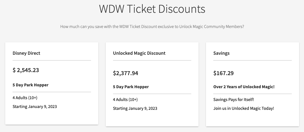 - Discounts and Promotions – Receive deals and promotions that are exclusive to the Unlocked Magic community. Inside Unlocked Magic, you will find the best discount for Walt Disney World tickets!