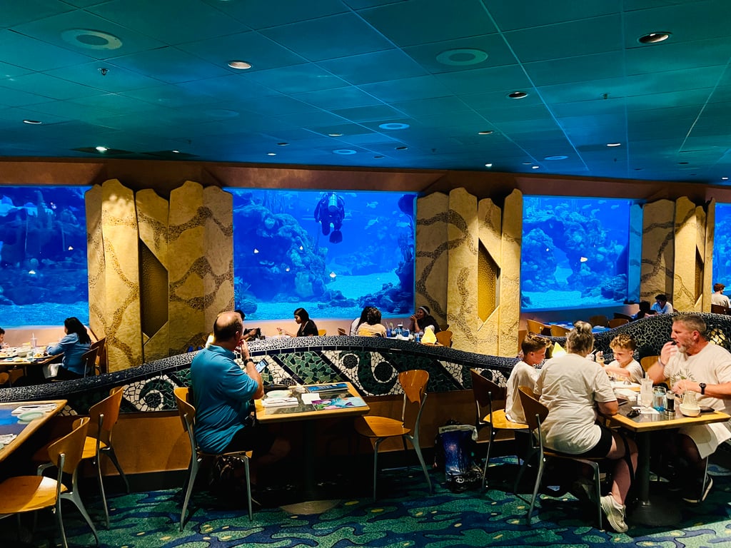 During a recent trip to the park, my hubby and I found ourselves with extra time on our hands and no dinner plans. After jumping into My Disney Experience and surveying the late afternoon options, we landed on eating at Coral Reef. It had been six years since I’d last dined there, and my hubby had only been there for a work engagement, so we figured it was time. We joined the Walk Up List and was notified that our wait would be approximately 10 minutes. We made out way to the restaurant when it was time, and were seated just minutes later.