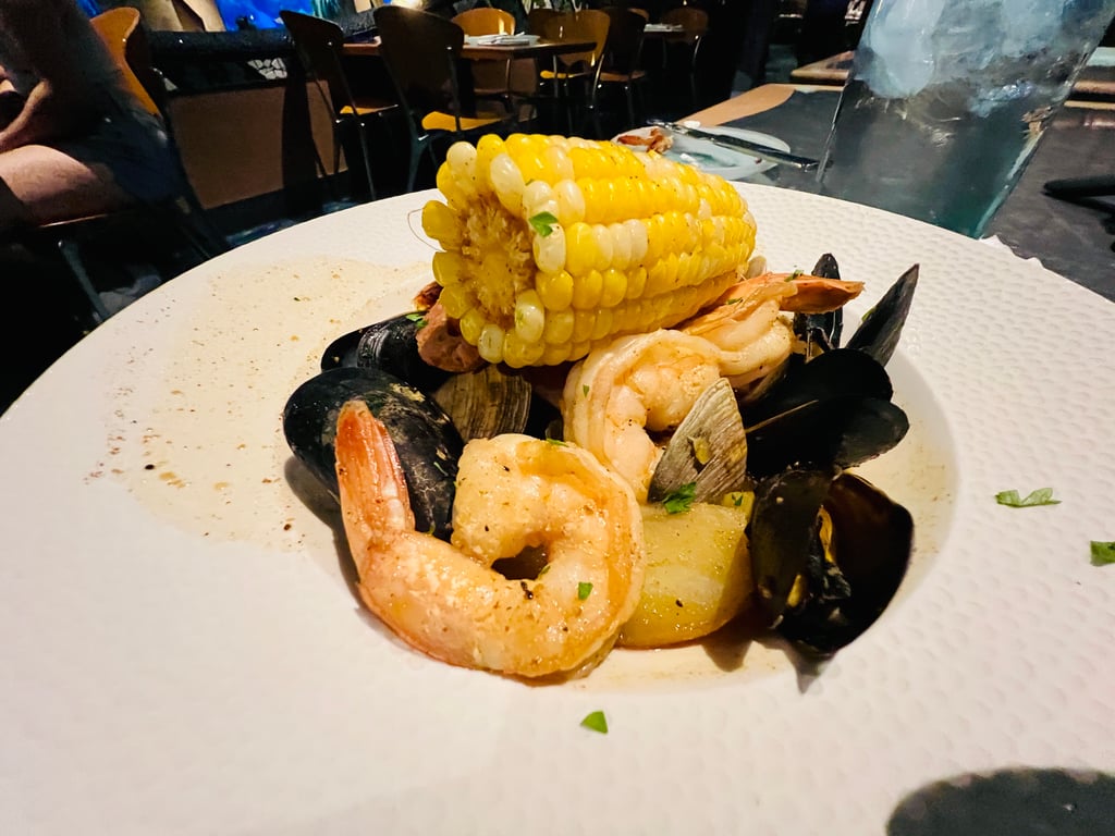 My hubby went with a dish that I’d place soundly in the ”hodgepodge” category: the Seafood Boil ($34). The overall taste of the boil was delicious, with a kick that brought a vibe of authenticity, but I would typically think of a seafood boil as being of Louisiana origin. Nonetheless, guests will be pleased to find that the clams, mussels, shrimp, andouille sausage, potatoes and a half an ear of corn all are prepared perfectly.