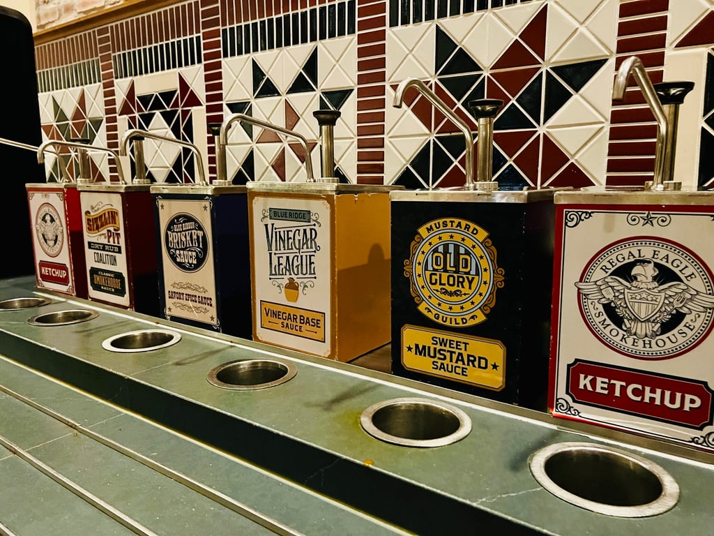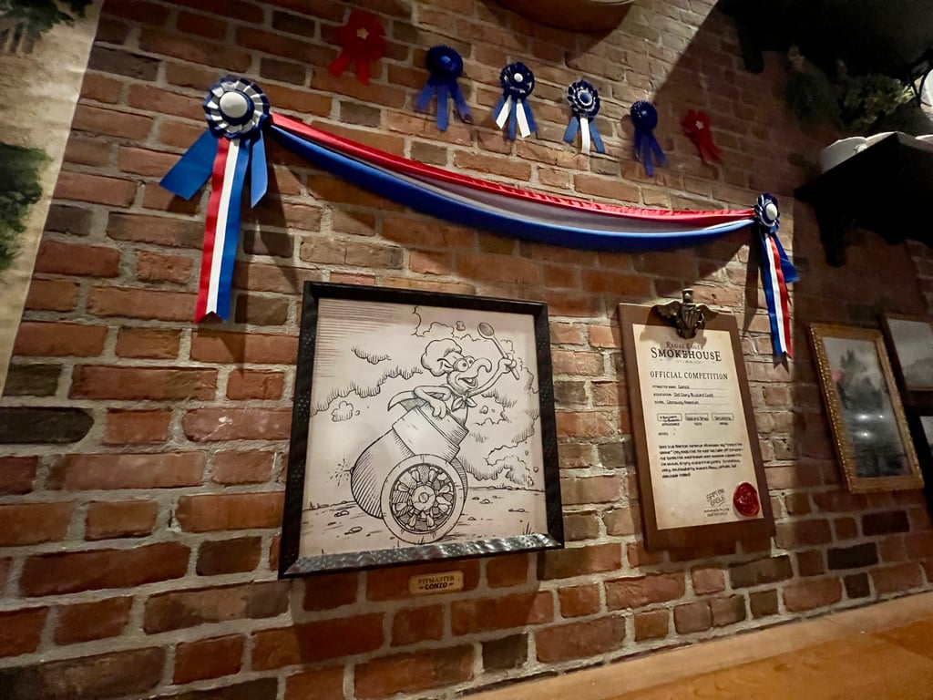 Regal Eagle Smokehouse is located at the center of the American Adventure pavilion, and the theming blends the feel of a barbecue competition with recognizable nods to The Muppets. Fans will notice references to Sam Eagle and his friends throughout the space, along with decorative touches that give the restaurant a lighthearted sense of humor without overwhelming the Americana theme.