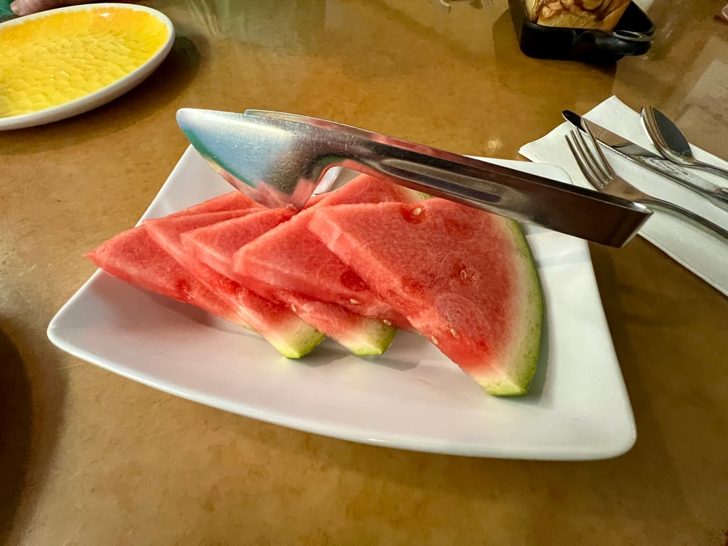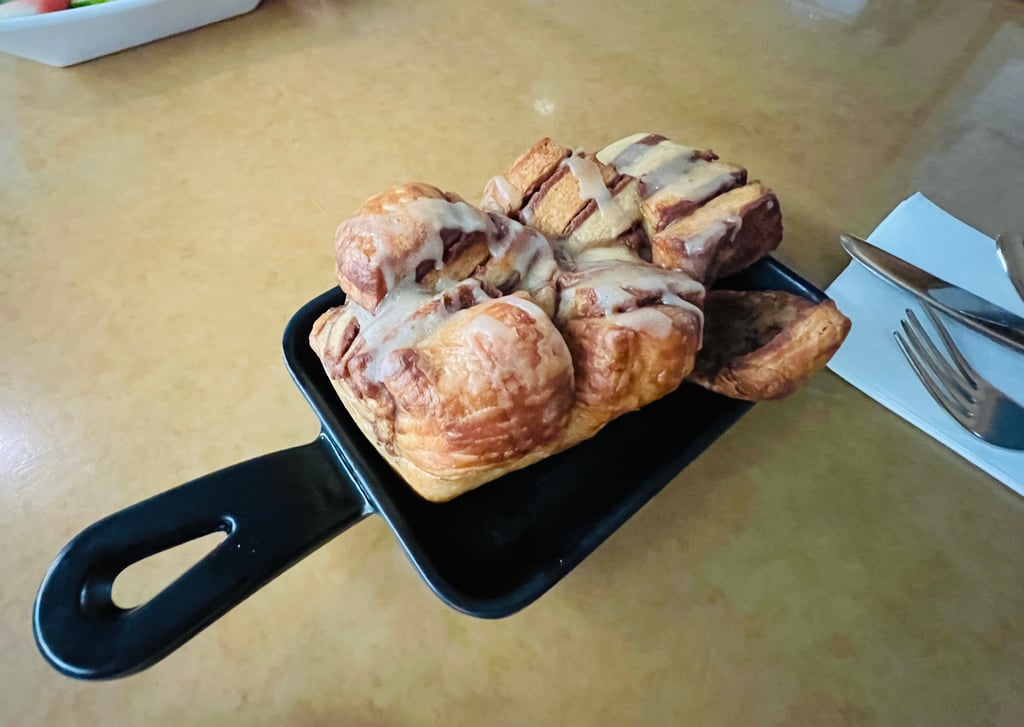 Sliced watermelon (which was delicious) and the new rendition of what used to be Chip and Dale’s Sticky Bun Bake will land on your table next. The Sticky Bun Bake was a thing of Disney dining legend. Since returning post-pandemic, the sugary treat has changed to be more of a caramel cinnamon loaf-type pastry. I found it to be quite dry, unfortunately.