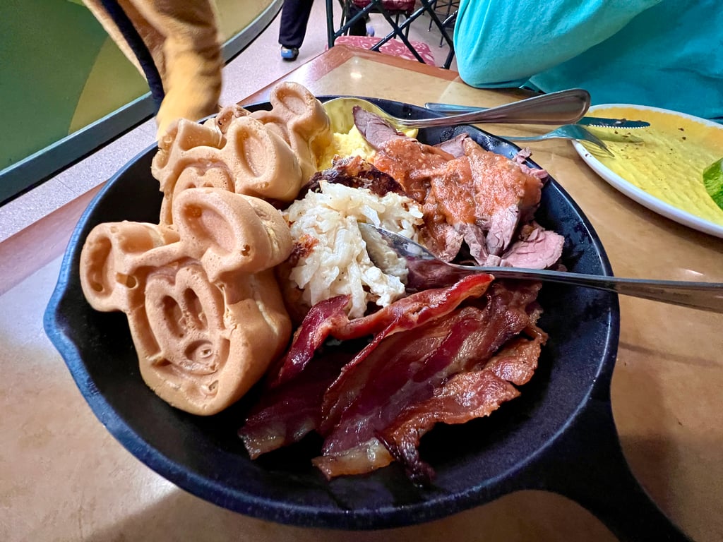 Your skillet will be the next thing to land on your table, and it features breakfast staples that you already love and some that you might not realize you need to love. Each “frying pan” includes scrambled free-range eggs, smoked bacon, skillet potatoes, Mickey waffles, and Backyard Grilled Steak with Farmer’s Ranchero sauce.