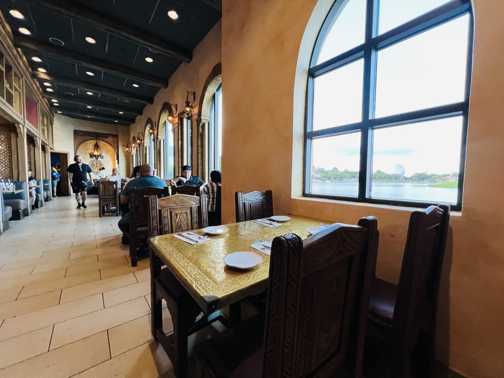 Spice Road Table sits right on the edge of World Showcase Lagoon, making it a prime spot if you enjoy waterfront dining. The restaurant offers both indoor and outdoor seating, and here is where I had one of my biggest Disney dining shocks.
