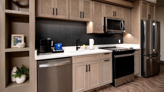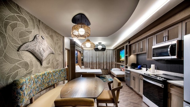 - Deluxe Studios: Explore the vibrant plant and animal life of the islands with our luxurious studios accommodating up to four guests. An exclusive addition to Disney Vacation Club deluxe studios, each features a dishwasher! The Island Tower’s deluxe studios boast a fresh layout, with a comfortable seating space opposite the kitchenette. This room features 1 Queen Bed and 1 Queen-Size Pull-Down Bed, accommodating up to 4 adults. Offering comfortable accommodations, it includes 1 full bathroom, a kitchenette with a microwave, small refrigerator, and small dishwasher, along with a porch or balcony.