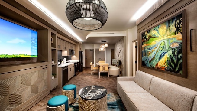 - One-Bedroom Villas: Each villa is adorned with distinctive artwork depicting a traveler’s adventure on land and in the sea. Whether inspired by water or land, these accommodations include a fully equipped kitchen, dining space, laundry facilities, and an outdoor patio. This room features 1 King Bed, 1 Queen-Size Pull-Down Bed, and 1 Single Pull-Down Bed, accommodating up to 5 adults. Perfect for families, it includes 2 full bathrooms, a full kitchen, living and dining areas, a washer and dryer, and a private deck for added convenience.