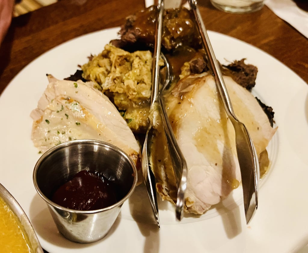 As I mentioned in a recent article, the menu is filled with classic comfort food. Think roasted turkey, pot roast, mashed potatoes, and stuffing, all served family-style so that everyone at the table can share. It’s hearty, filling, and nostalgic, like Thanksgiving dinner tucked inside the magic of a Disney park.