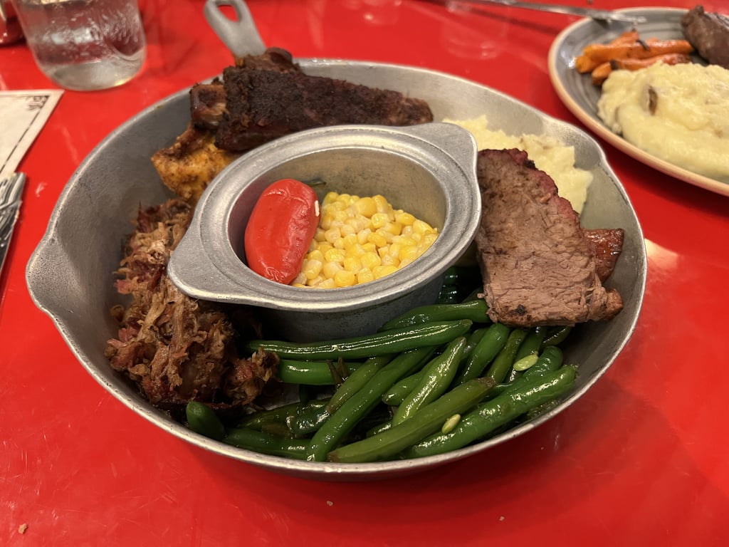 At the table, you’ll find bottomless skillets piled high with smoky meats, roasted vegetables, cornbread, and mac and cheese. It is the kind of meal that is designed for gathering, with big plates, hearty servings, and flavors that remind you of autumn evenings at home.
