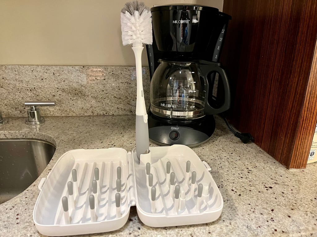To wash bottles and any pump parts, it’s helpful to bring a travel drying rack and bottle brush. (You won’t need to worry about dishwashing liquid since that is provided.) If you need to sterilize bottles and pump parts, the microwaveable sterilization bags are convenient, especially when staying in a studio.