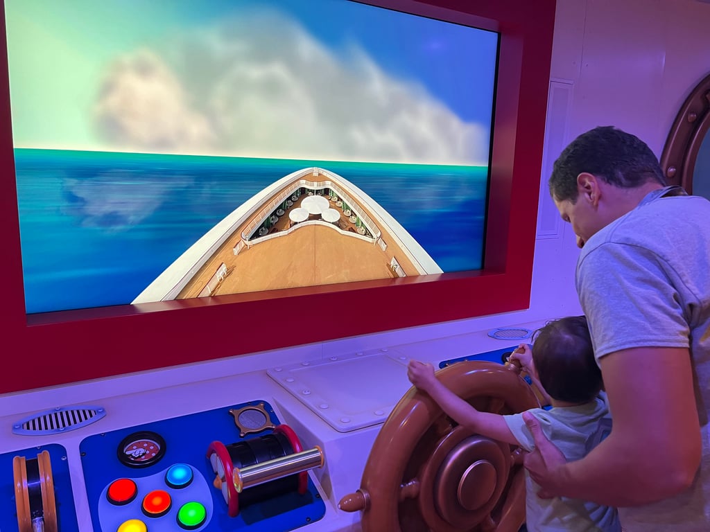 If your child prefers to stay with you instead of being dropped off at the “it’s a small world” Nursery, he or she may want to try Toddler Time in Mickey and Minnie Captain’s Deck on Deck 2. During specific hours, toddlers (and their parents) can enjoy the ship-themed playroom. There’s a slide, things to climb, toys, and even a ship bridge where tots can have fun pressing buttons and turning the steering wheel. Mickey and Minnie Captain’s Deck is also available during the open house, but those hours tend to be busier and include older kids. You can find the hours for Toddler Time in the navigator app.