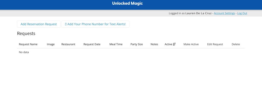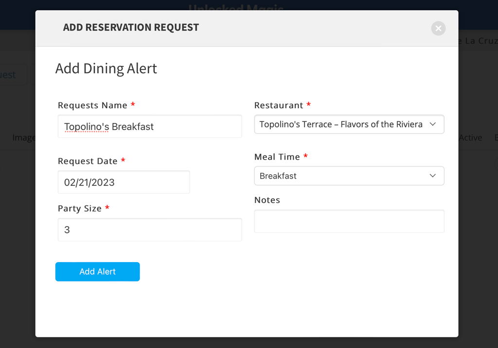 To create a new dining alert, click on “Add Reservation Request.” Since you have an unlimited number of alerts, add a dining alert name to help distinguish it from your other requests. Then fill in your request date and party size, and select the restaurant name from the drop down window. For the meal time, you can either set a wider alert for a specific meal (breakfast, lunch, or dinner) or set a specific time. To save the request, click “Add Alert.” If you would like to make changes to your request, go back to your dashboard and click “edit” next to the request you would like to modify.