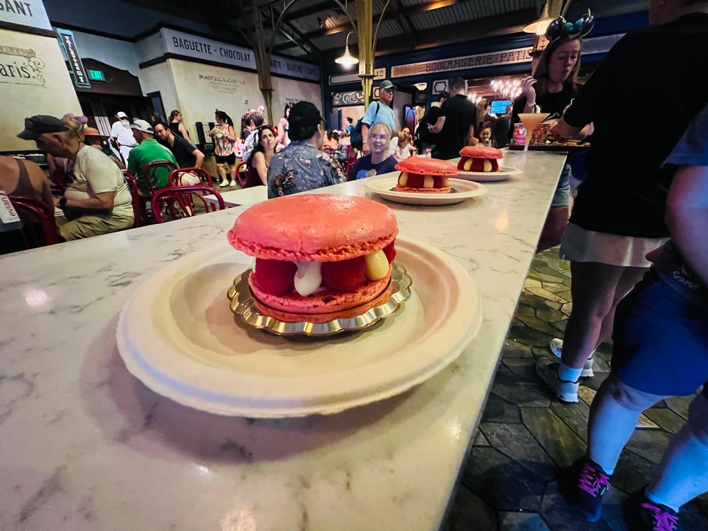 Our first stop had us making our way to the France pavilion. Katrina‘s choice was the Macaron Lime Raspberry ($7.50) from Les Halles Boulangerie-Patisserie. This was a strong start, friends. I know we all have our favorite snacks, but I’m not sure I ever would’ve come up with that macaron. That being said, it was the perfect place to begin our quest. The macaron is completely shareable, which, in my mind, helps to justify the treat’s steep price tag. The fresh raspberries, the chewiness of the macaron, and the brightness of the lime cream all marry together to create a flavor and texture explosion. It’ll wake up your taste buds and get you going for the rest of your EPCOT day.