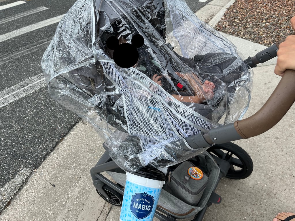 In Florida, there’s often a chance of rain, especially during the summer. Keep your stroller dry by bringing a rain cover. At Disney World, you’ll have to park your stroller outside whenever you go to an attraction or table service restaurant. It helps to put the cover on your stroller whenever you park it since you never quite know when there will be a passing shower.