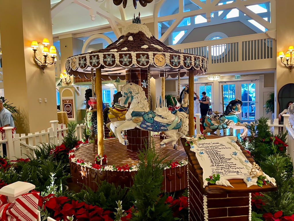 In the Beach Club lobby, you’ll find a gingerbread carousel that actually rotates! The theme of the carousel changes each year. In 2022, the carousel was themed after Disney princesses, including Snow White, Belle, Elsa, Jasmine and Tiana.