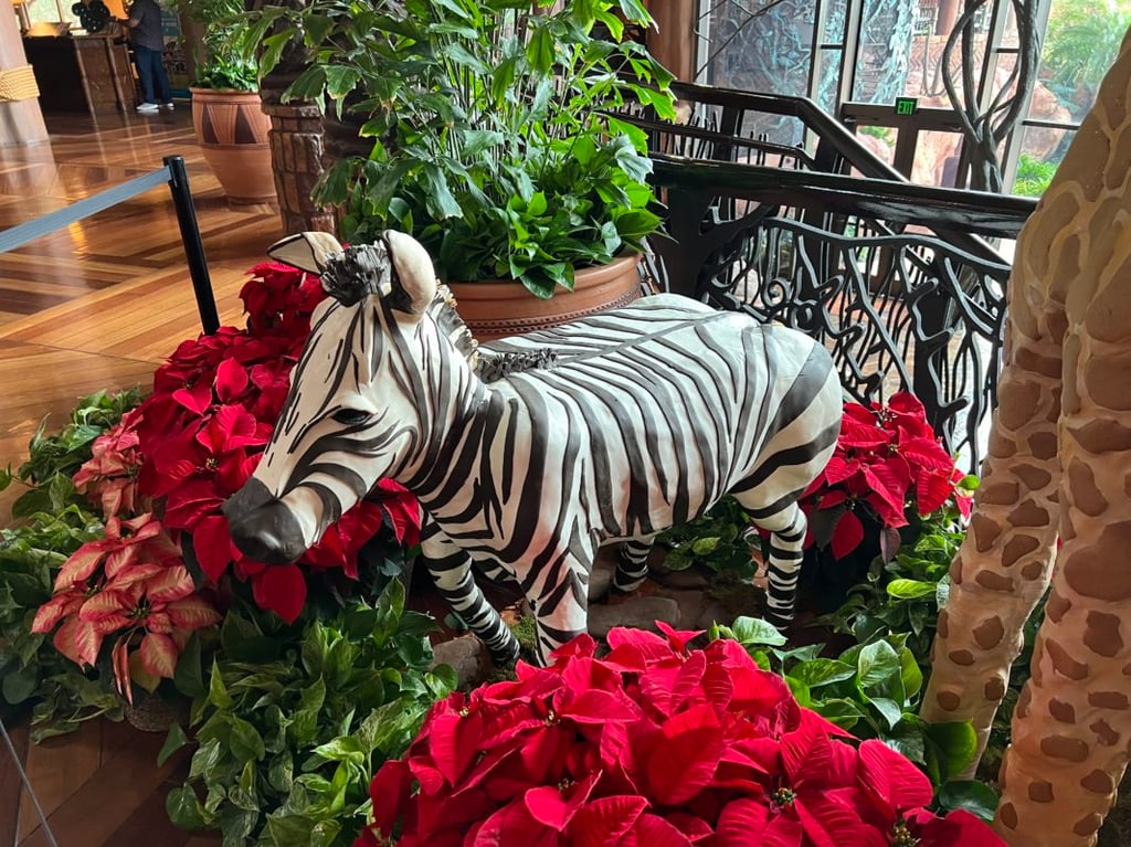 The gingerbread display is typically located in the lobby of Jambo House. The display has changed slightly each year but is inspired by the many animals that call Animal Kingdom Lodge home, such as a giraffe and zebra.
