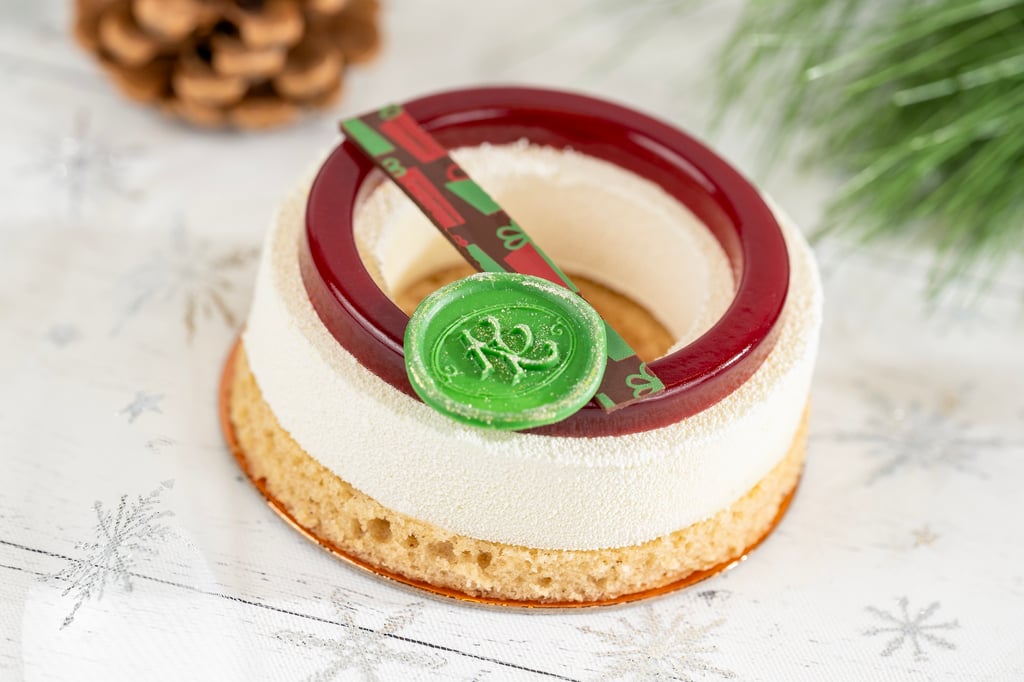 - Gingerbread Eggnog Entremet: Gingerbread financier, eggnog panna cotta, and raspberry gel